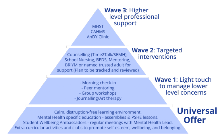 A calm and focused learning environment. School values that are living values to promote respect and value diversity. Assemblies and PHSE sessions that help everyone identify what mental health is, strategies to manage poor mental health and where to seek further help. Encouraging participation in extracurricular activities and clubs to promote self-esteem, wellbeing and belonging. Student Voice influencing school provision through our Wellbeing Ambassadors. Each tutor group has a representative who meets to discuss whole-school mental health and well-being.